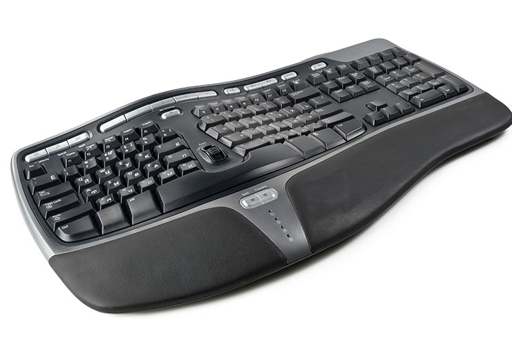מקלדת ארגונומית: עבודה ממושכת על המקלדת אינה בריאה עבור שורש כף היד. התנוחה בה מניחים את כפות הידיים במקלדות הקלאסיות אינה נכונה מבחינה בריאותית, ולאחר תקופה ארוכה של שימוש חוזר עלולה לגרום לנזקים בריאותיים. מחקרים מקיפים על ידי מומחים לארגונומיה, הביאו לפיתוחן של מקלדות המוגדרות כמקלדות ארגונומיות. ארגונומיה היא תחום מתוך הנדסת אנוש, ומטרתה היא התאמת סביבת העבודה לאדם המפעיל את המכונה. מקלדת ארגונומית בנויה באחד משני אופנים: הראשונה והיותר מקובלת היא המקלדת המעוצבת בצורת גל עקום, כאשר כל המקשים מונחים על המקלדת בצורה של גל. הצורה השנייה והפחות קונבנציונלית היא מקלדת ארגונומית אשר מפצלת את לוח המקשים לשני חלקים, וממקמת כל מערכת מקשים באופן ישיר מול כף היד שתפעיל אותם. בשתי השיטות, המטרה היא להביא לצורת עבודה נכונה, כאשר כף היד ישרה בשעת ההקלדה, ולא עקומה או נטויה בזווית לא טבעית. משתמשים השוקלים לעבור ממקלדת רגילה למקלדת ארגונומית, צריכים לעבור תקופת הסתגלות, כיוון שמרווחי המקשים יכולים להיות שונים מהמקלדת הרגילה, כמו גם גודלם של המקשים אשר שונה מהמקלדת הקונבנציונליות.