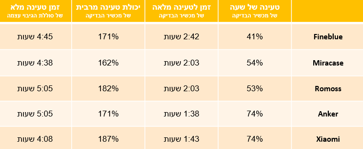 בנוסף, בדקנו את נוחות השימוש והפיצ'רים המיוחדים של כל סוללה. את בדיקות הטעינה ביצענו עם המכשיר Samsung Galaxy S10 Plus, שלו סוללה בקיבולת של 4,100mAh. התוצאות לפניכם.